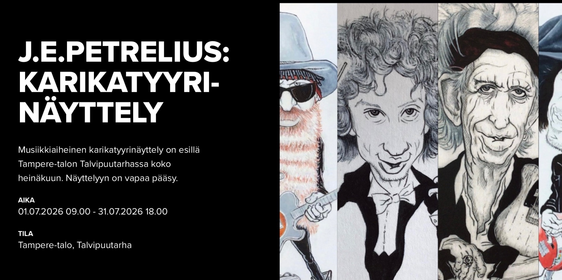J.E.Petreliuksen musiikkiaiheinen karikatyyrinäyttely on nähtävissä Tampere-talon Talvipuutarhassa 1.–31.7.2026. Näyttelyyn on vapaa pääsy ja se on avoinna Tampere-talon aukioloaikojen mukaisesti. Näyttely on esteetön.
